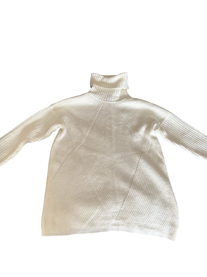 Beyaz boğazlı, uzun kollu, fit kesim kadın kazak. Örgü triko kumaştan, düz ve çağdaş tasarıma sahip, midi boyda rahat model.