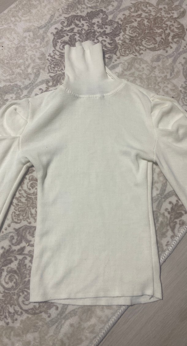 Beyaz boğazlı, uzun kollu, vücuda oturan kadın kazağı. Örgü yapıda sentetik kumaştan, rahat ve sokak stiline uygun.