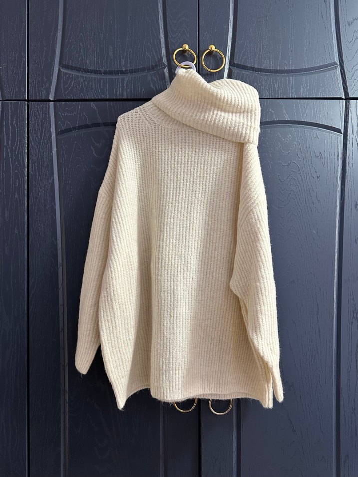 Beyaz renkte, boğazlı ve uzun kollu, bol kesim triko kazak. Rahat ve sade tasarımıyla günlük kullanıma uygundur.