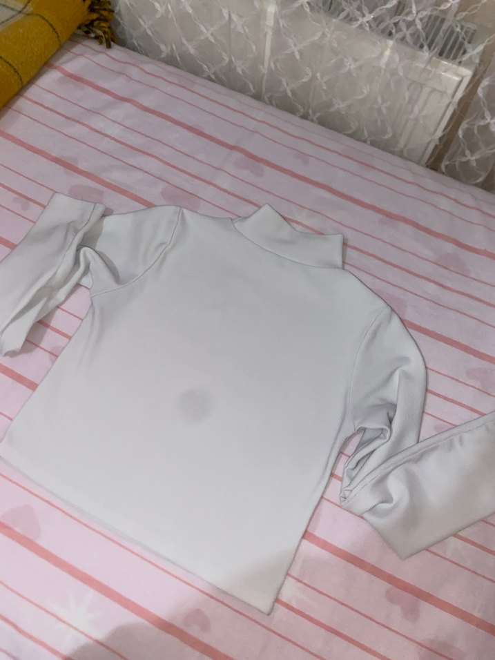 Beyaz boğazlı ve uzun kollu, dar kesim basic tişört. Yumuşak sentetik kumaştan, sade ve pastel tonlarda, rahat bir stil sunar.
