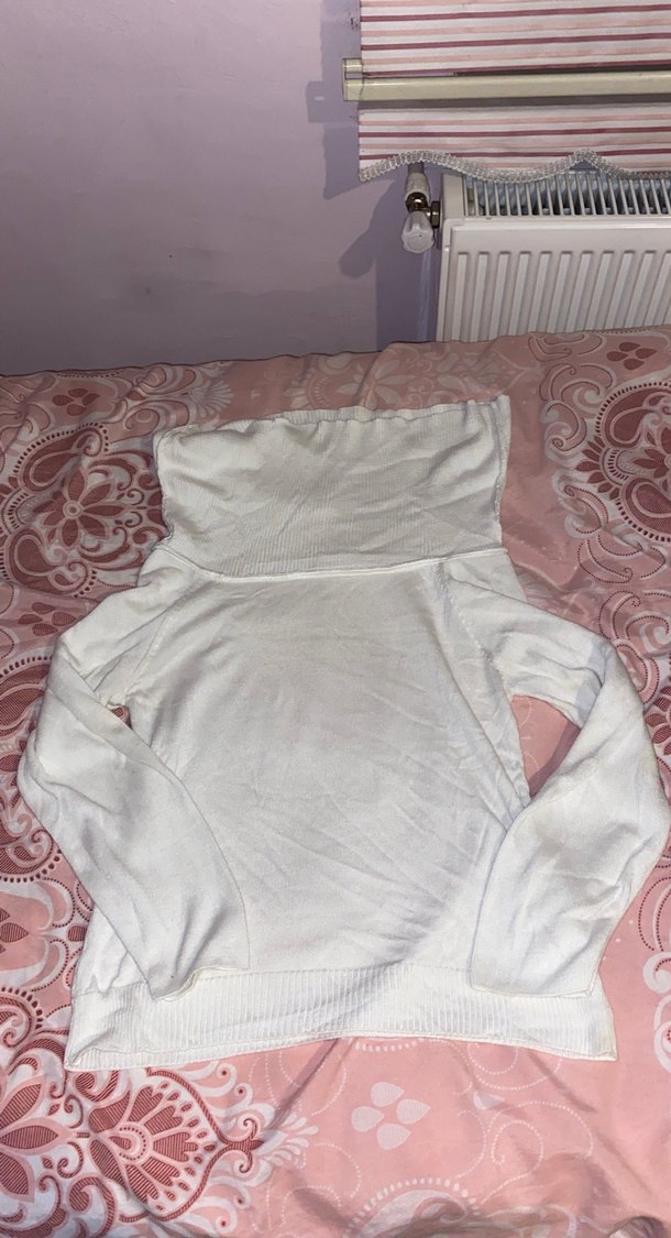Beyaz, boğazlı ve uzun kollu kadın kazak. İnce örme sentetik kumaştan, normal midi boyunda, desensiz ve sade tasarımda. Günlük rahat stil için uygun.