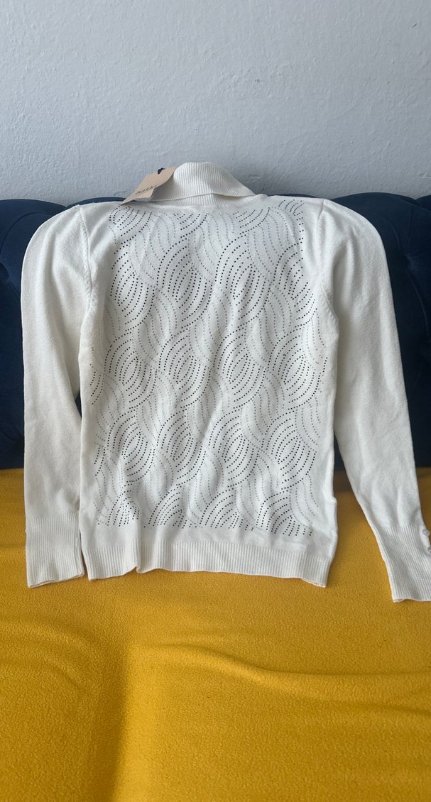 Bu beyaz, boğazlı ve uzun kollu triko kazak, sırtında zarif delikli dalga desenine sahiptir. Rahat ve çağdaş bir tarz sunar, günlük kullanım için uygundur. İki koltuk arası 40 cm Koltuktan eteğe boyu 40 cm Komple boy 58 cm Yeni etiketli
