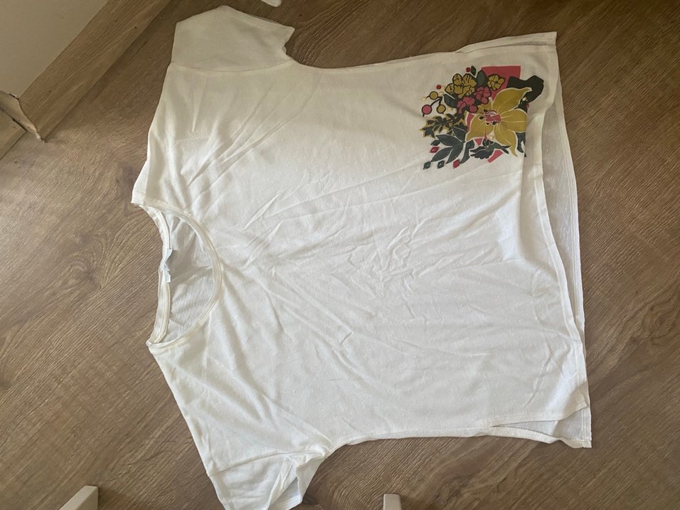 Pamuklu, beyaz, bohem tarzda, kısa kollu, yuvarlak yaka, drapeli, renkli çiçek baskılı bol kesim hamile tişörtü. Xl beden mavi marka