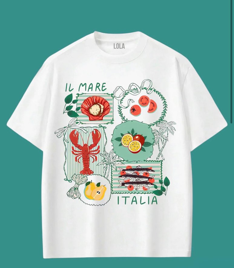 Bohem tarzda, deniz temalı baskılı beyaz kız tişörtü. Yumuşak kumaştan, kısa kollu ve yuvarlak yakalı, bol kesim.