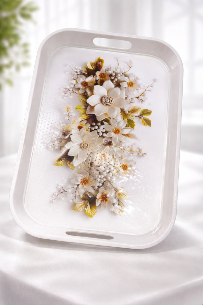 Beyaz bohem tarzda, ayrıntılı çiçek ve yaprak desenli canlı baskıya sahip hafif ve kullanışlı tepsi.