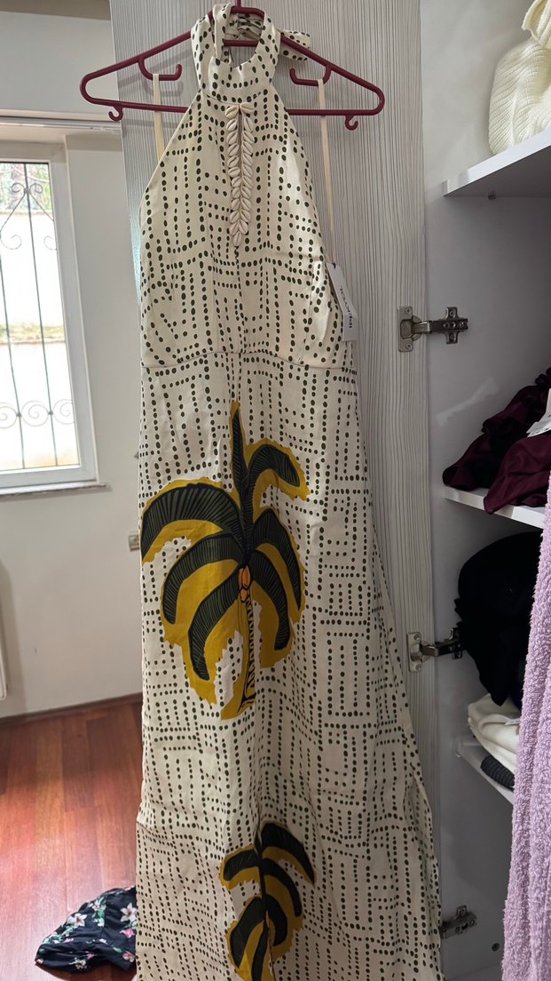 Suni kumaştan, uzun, kolsuz ve salaş kesim halter yaka elbise. Koyu renkli bohem desenlerle süslenmiş, günlük kullanıma uygun.