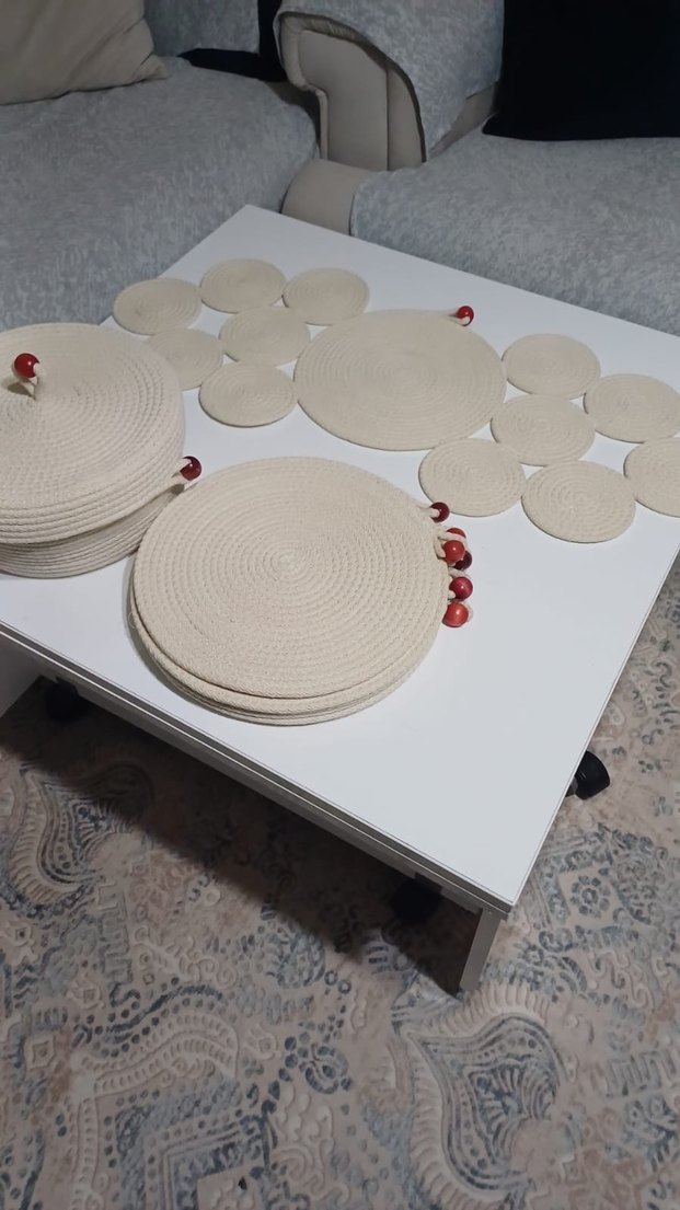Küçük kırmızı boncuk detaylı, örme dokuda beyaz bohem tarzda yuvarlak tabak altlığı seti. Masa koruma ve dekorasyon için uygundur. ️