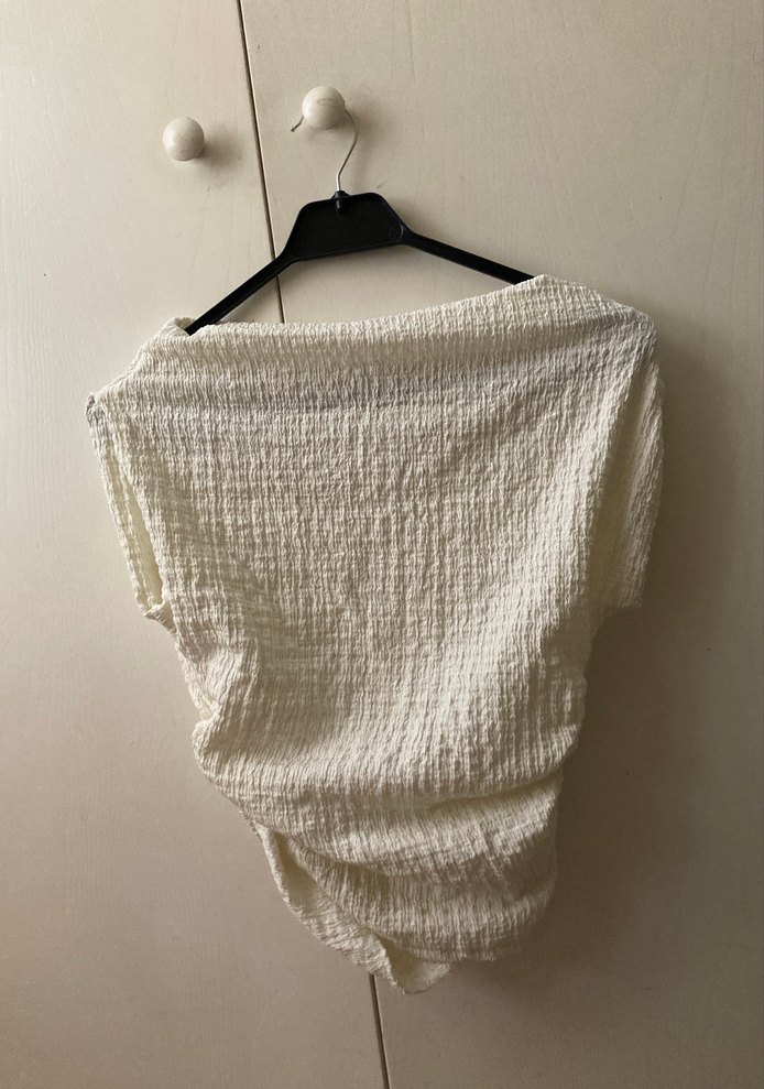 Beyaz , dökümlü ve salaş kesime sahip, kayık yaka ve kolsuz kısa boy kadın bluz. Minimalist ve bohem tarzda, günlük kullanım için uygundur.
