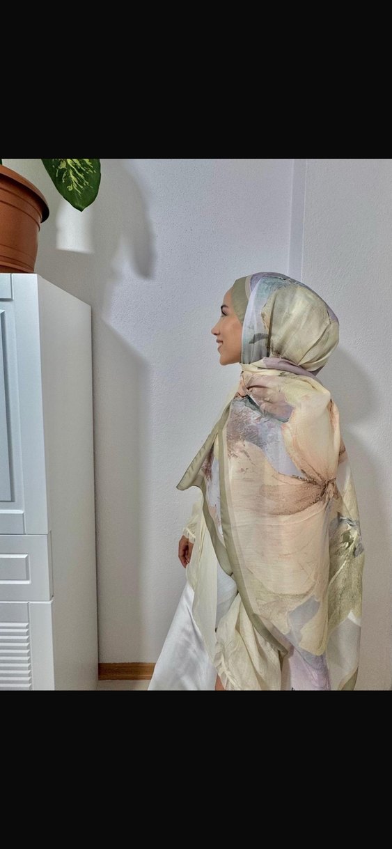 Hafif beyaz renkte, ipeksi dokulu, drapeli kadın şalıdır. Mütevazı ve bohem tarzı yansıtır.
