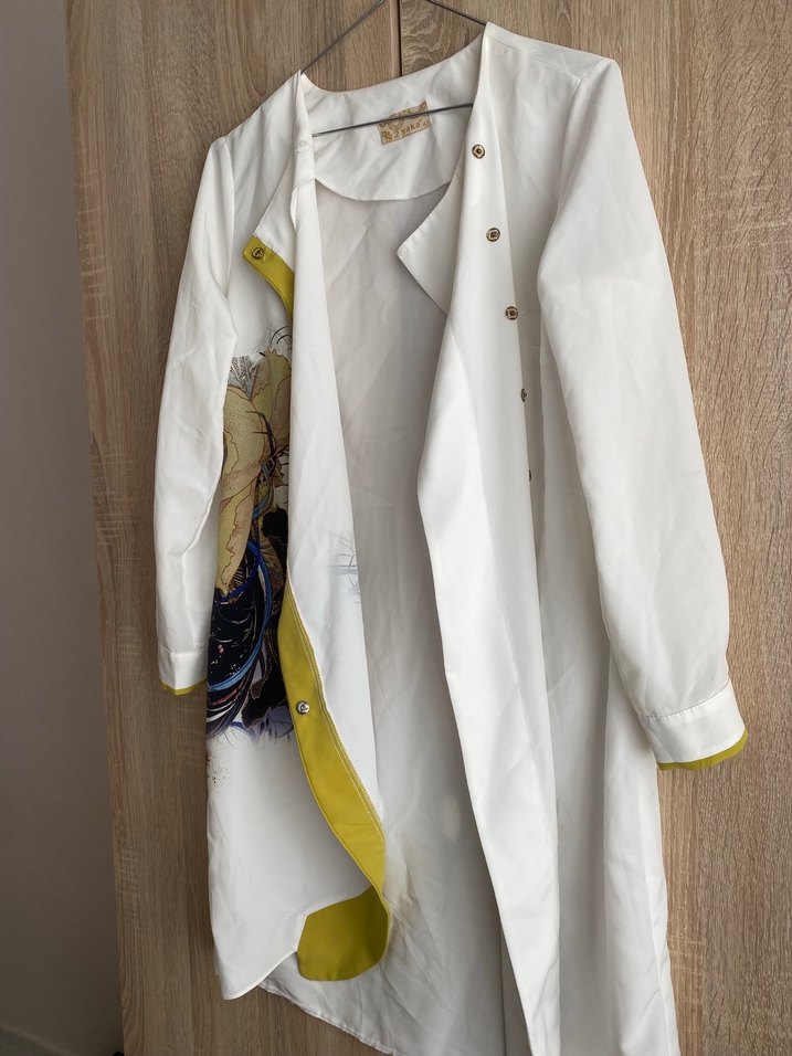 Düğmeli, uzun kollu, beyaz tunik. Keten kumaştır 42 beden ama kalıbı çok geniş bi ürün değil 38 bedene kadar uyumlu