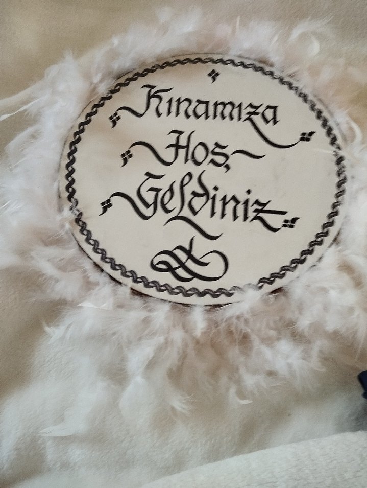 Tüylerle çevrili, parlak beyaz renkte, "Hinamiza Hoş Geldiniz" yazılı bohem ve retro tarzda erkek rozeti. ️