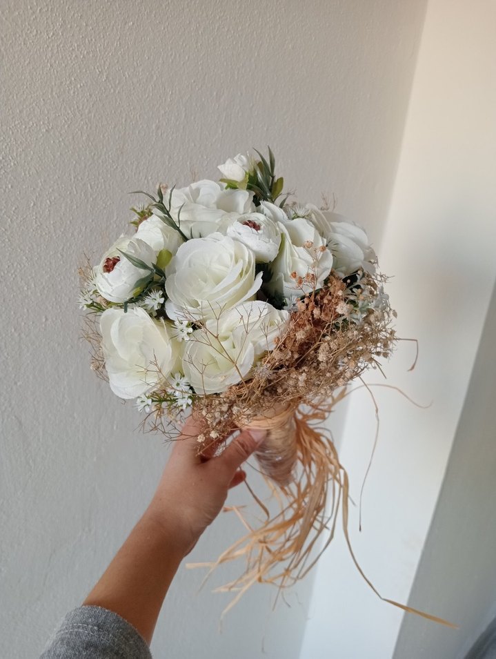 Beyaz bohem gelin çiçeği, minimal tarz düğünler için narin kurutulmuş süslemelerle tamamlanmıştır.