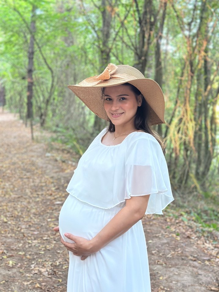 , kısa kollu ve drapeli beyaz, bol kesim hamile elbisesi. Bohem tarzıyla açık hava etkinlikleri için uygundur.