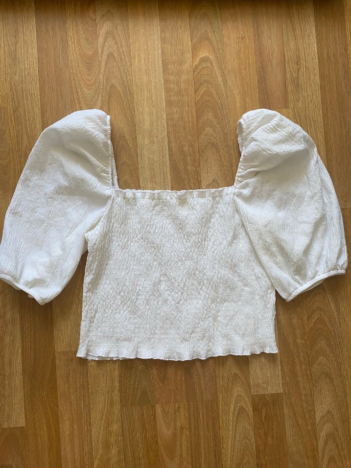 Kısa balon kollu, kare yakalı beyaz bluz. Bol kesim bohem tarzına uygun. L bedendir.Çok az giyildi.Deformesi yoktur.