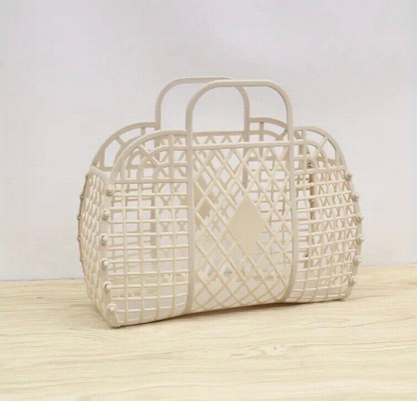 Beyaz renkte, hafif plastik malzemeden yapılmış, bohem tarzda, gündelik kullanıma uygun kadın çantası.