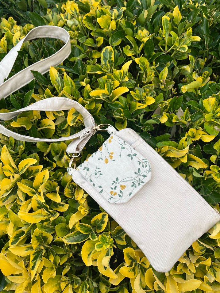 Sentetik kumaştan yapılmış, beyaz çapraz çanta. Bohem desenli ve fermuarlı, ayarlanabilir askılı günlük kullanıma uygun.