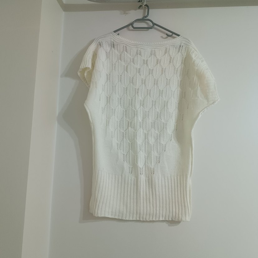 Beyaz renkli, kısa kollu, yuvarlak yakalı, bol kesim örgü kadın kazak. Bohem tarzda, midi boyda ve sade tasarımlı, günlük kullanıma uygun.