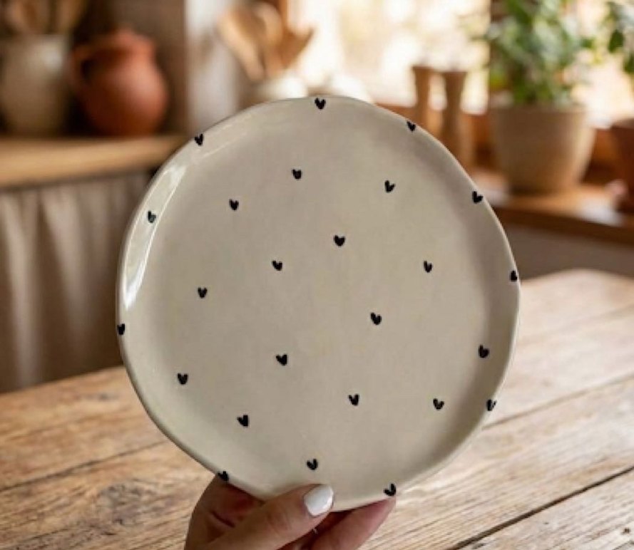 Küçük koyu renk kalpler içeren beyaz renkli bohem tarzda tabak, masanıza gündelik bir dokunuş katıyor. ️