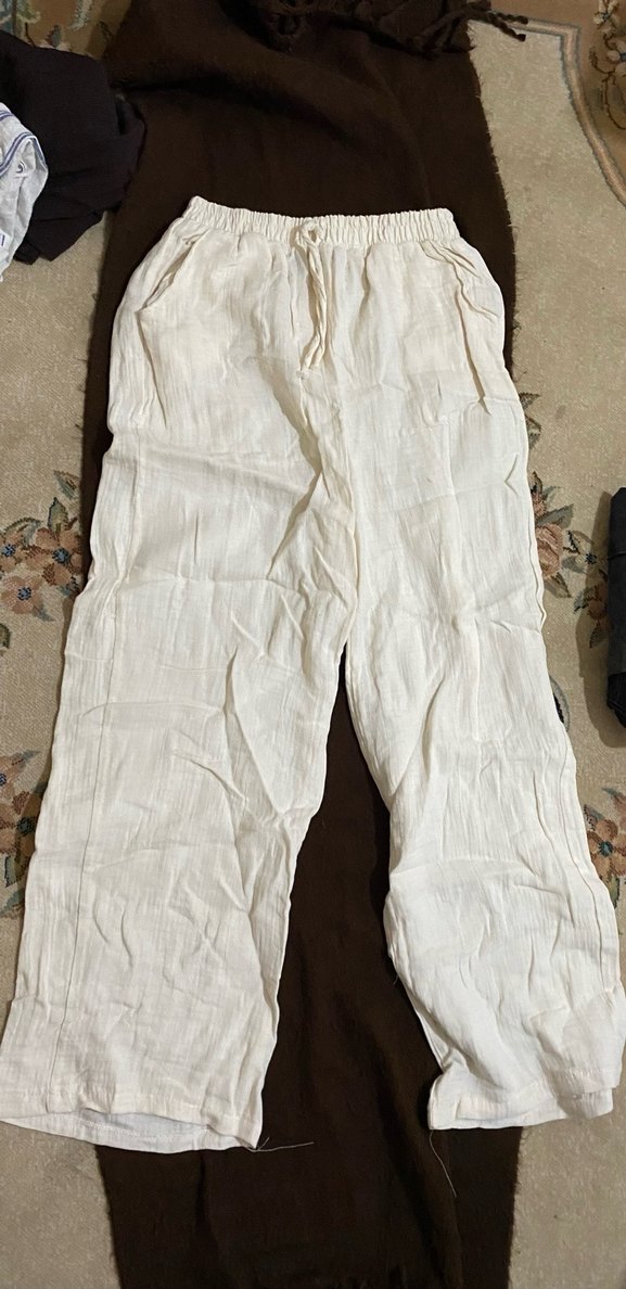 Salaş kesim, keten kumaştan, beyaz renkte, drapeli midi boy bohem tarz pantolon, günlük kullanıma uygun.