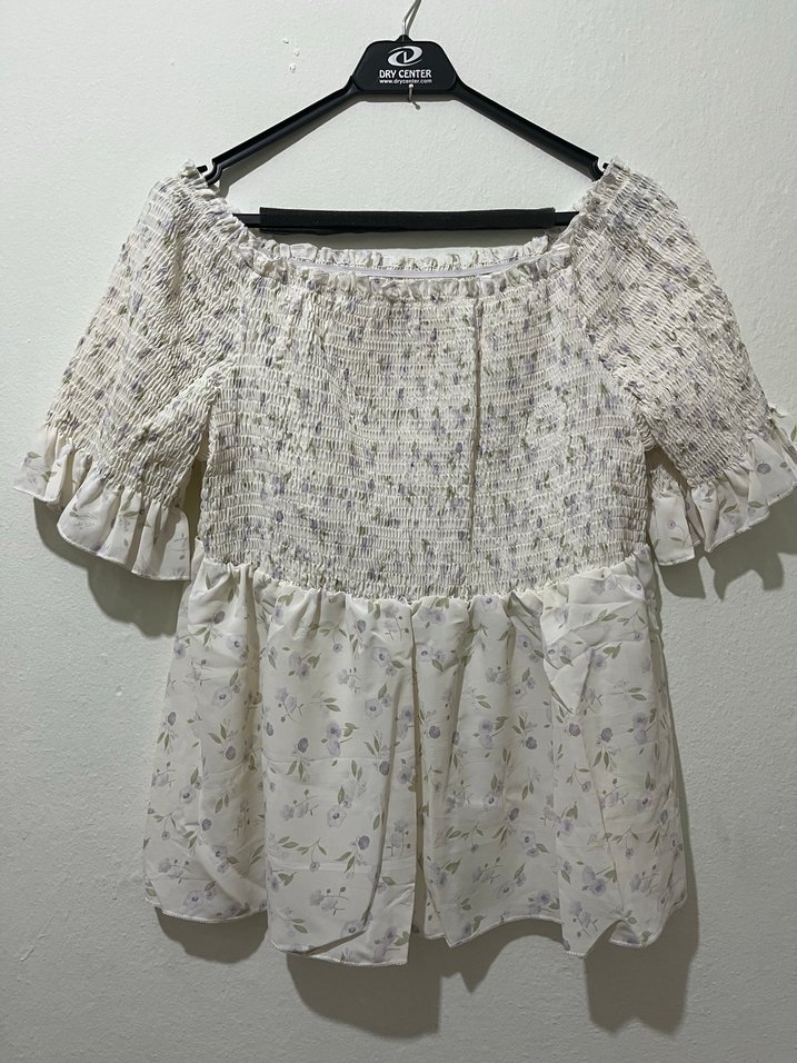 Beyaz renkte, kısa kollu, tekne yaka ve fırfırlı detaylara sahip bohem tarzda, bol kesim bir bluz. Hafif batik desenlidir ve günlük kullanıma uygundur.