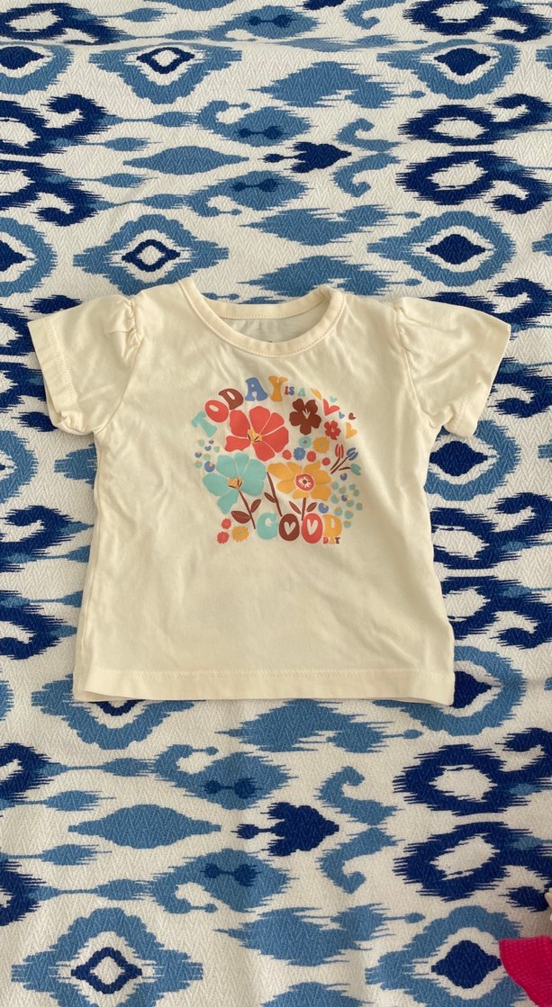 Pamuklu, beyaz renkli, yuvarlak yaka ve bol kesim kız çocuk tişörtü. Önünde çiçekli "Today is a good day" baskısı bulunan bohem tarzda kısa kollu tişört.