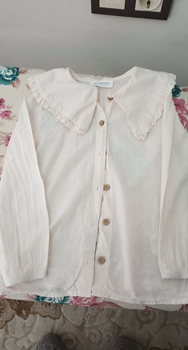 Bol kesim, büyük yakalı, düğmeli, pastel beyaz keten kız gömleği, bohem tarzını yansıtıyor.