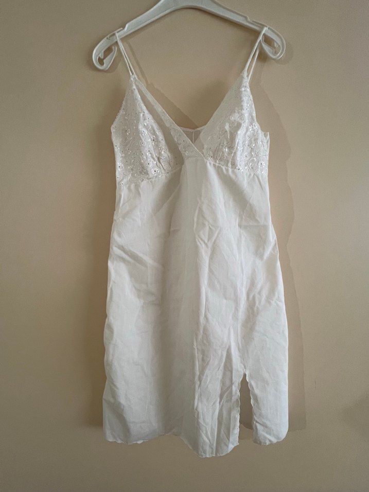 Dantel detaylı, beyaz, kolsuz midi gecelik. Bohem tarzda, bol kesim ve hafif minimalist tasarıma sahip. hiç kullanılmadı