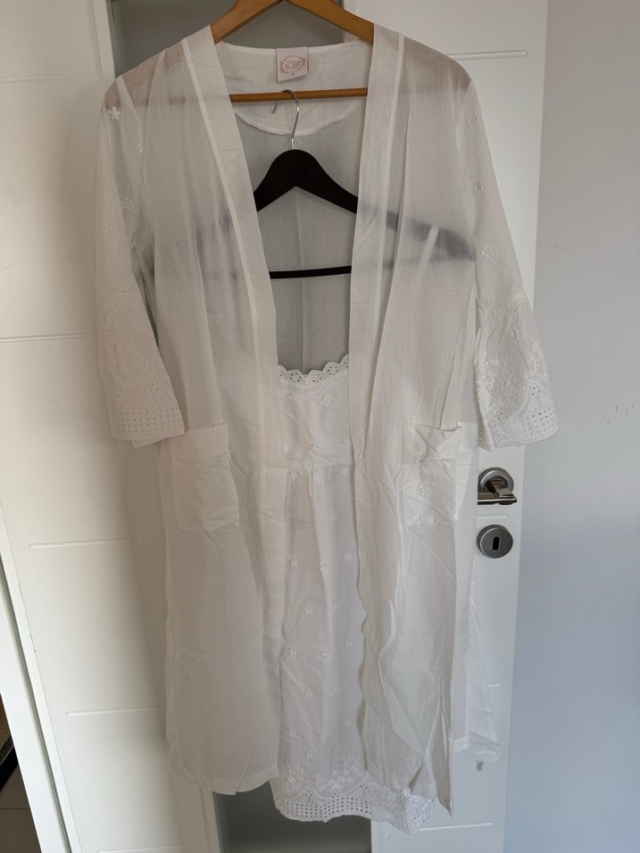 Gevşek kesim, beyaz bohem stilde, askılı kollu midi uzunlukta sabahlık, narin dantel detaylara sahip ve hafif kumaşlıdır.