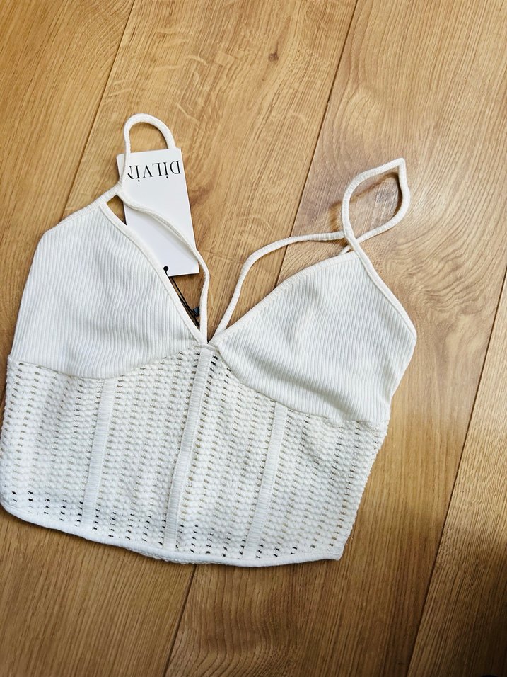 Beyaz, ince askılı, kısa mini uzunlukta bohem tarzı bralet. Alt kısmı nefes alabilen dokuma detaylı, rahat ve şık. Spor şıklığı için uygun.