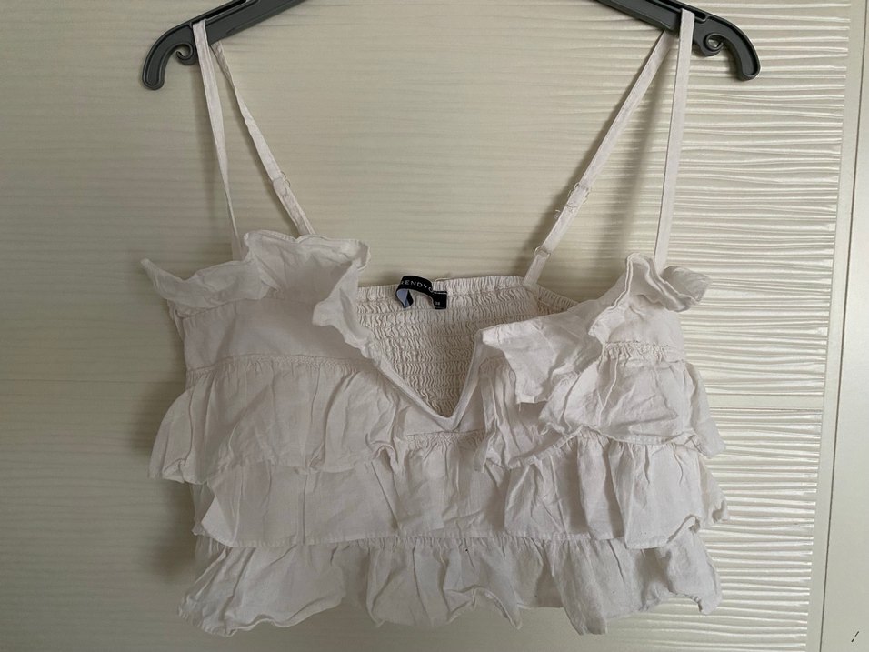 Beyaz, bohem tarzda kısa kesim bralet, ayarlanabilir askılar ve fırfır detaylarla sade ve hafif tasarımıyla öne çıkar.