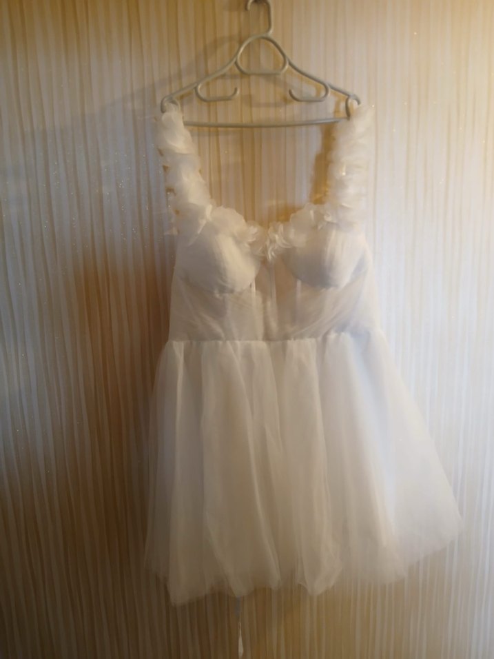 Beyaz, straplez ve ince askılı, fitted kesim bohem tarzda mini gelinlik. Hafif ve vintage esintili tasarımıyla öne çıkar. Sıfır gümrükten