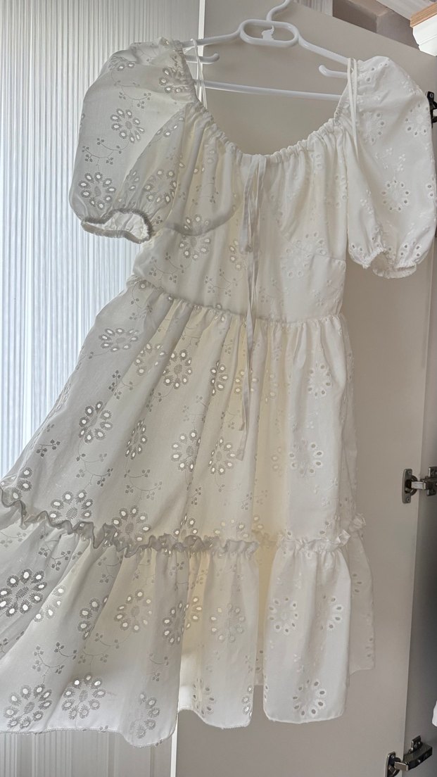 Beyaz bohem mini gelinlik, gevşek kesim, balon kollu ve kayık yaka, zarif fisto işlemelerle süslenmiş, yumuşak ve romantik bir görünüm sunar.