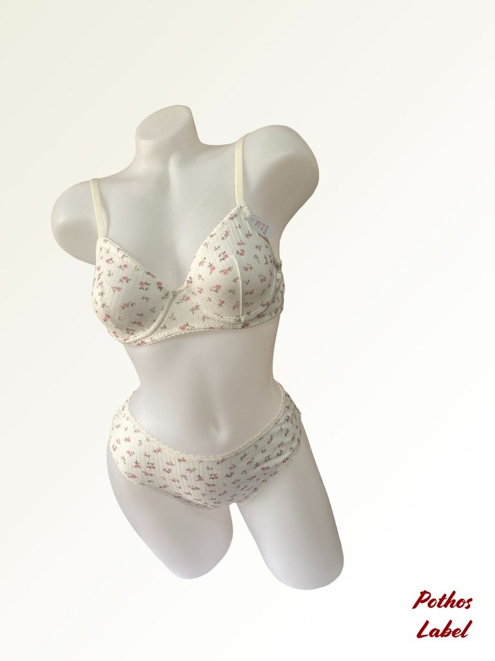 Beyaz renkte, bohem tarzda kısa sütyen. Hafif ve desenli kumaş üzerine küçük çiçek detayları bulunur. Pothos Label etiketi mevcuttur. 80/85/90 bedenleri mevcuttur.