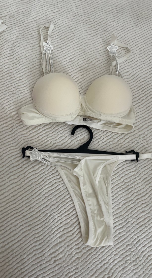 Beyaz renkli, minimal ve bohem tarzda sütyen ve külot takımı, sade kumaş ve dekoratif askılar içerir. ✨75 beden yanında hediyesi vardır