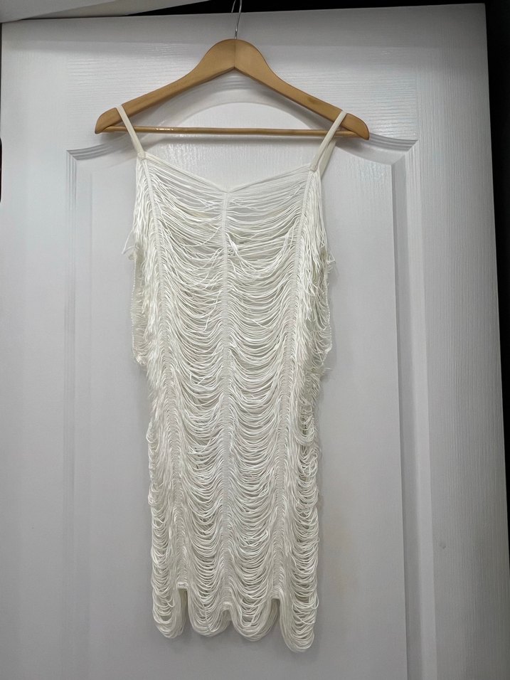 Beyaz bohem tarzda, nakışlı ve drapeli uzun abiye elbise, ince askılarla ve vücuda oturan kesimle parti için uygundur.