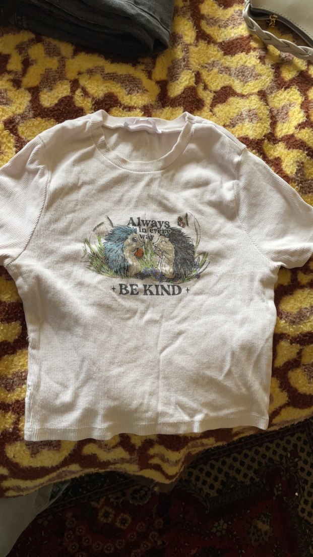 Beyaz pamuklu, kısa kollu, yuvarlak yakalı ve bohem tarzda, nakışlı baskılı, ince dokulu kadın tişörtü. Üzerinde 'BE KIND' yazısı bulunur.