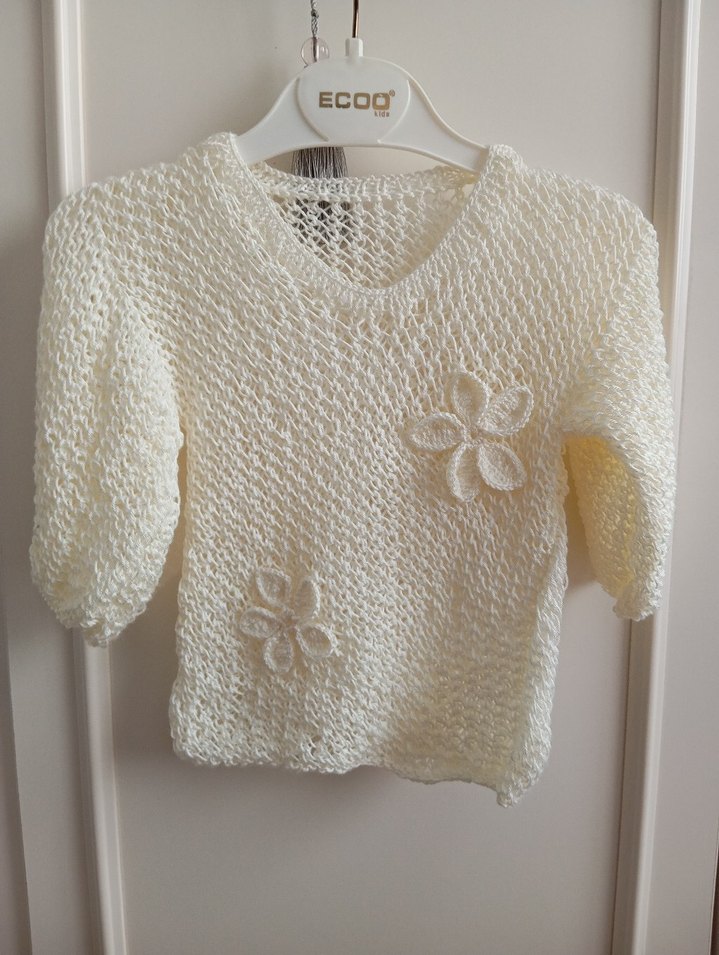Beyaz renkli, bohem tarzda, nakışlı çiçek desenli, bol kesim kız trikosudur. Uzun kollu ve yumuşak örgü dokusuna sahiptir. iki kol arası 24 cm.boy 29 cm. Marka temsilidir ❗