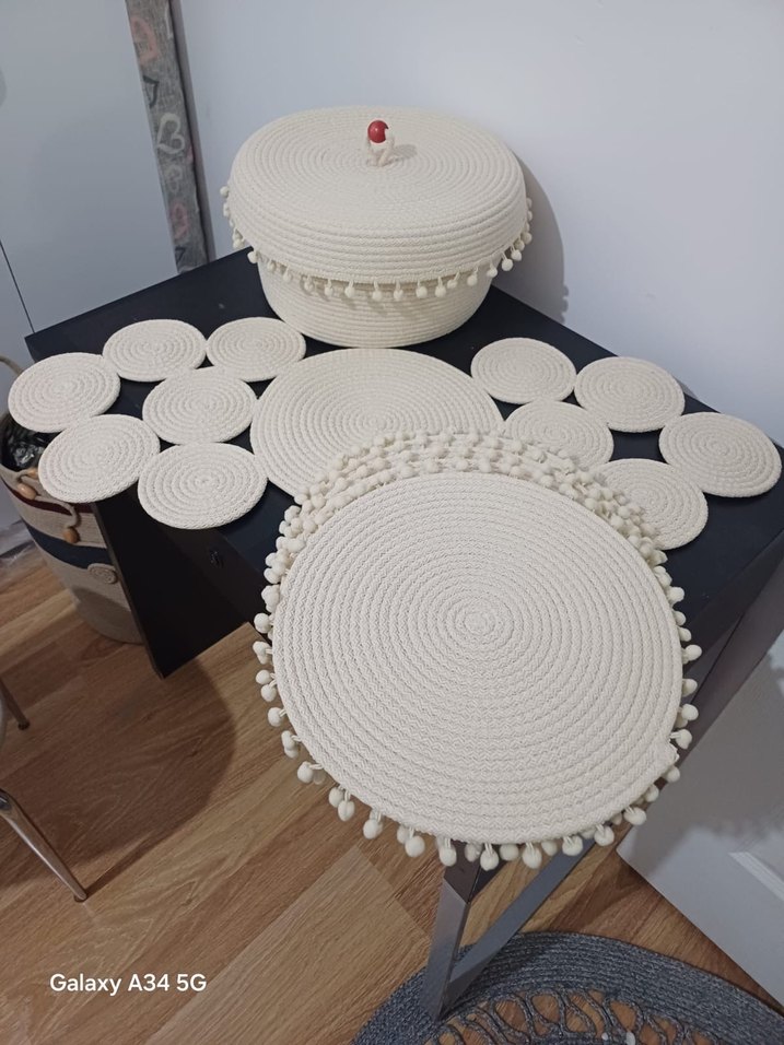 Beyaz bohem tarzda, işlemeli ve ponpon detaylı dokulu masa seti. Yemek alanınıza hafif ve samimi bir hava katar. ️