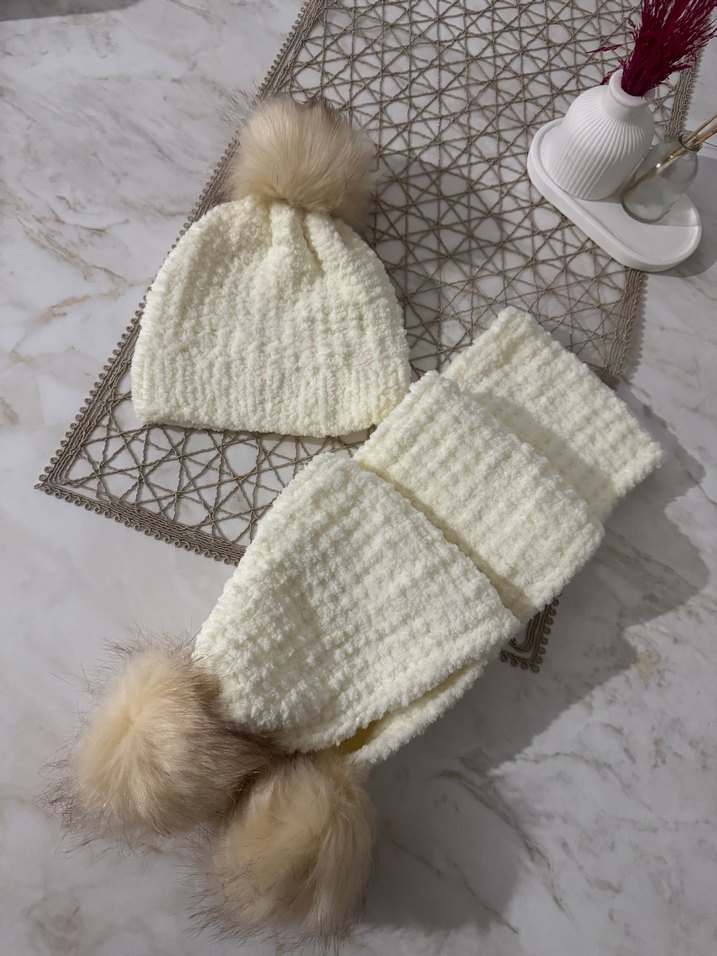Beyaz renkte, bohem nakışlı örgü çocuk bere ve atkı seti, yumuşak ponponlarla tamamlanmış, pastel tonlarda sıcak tutar. ❄️