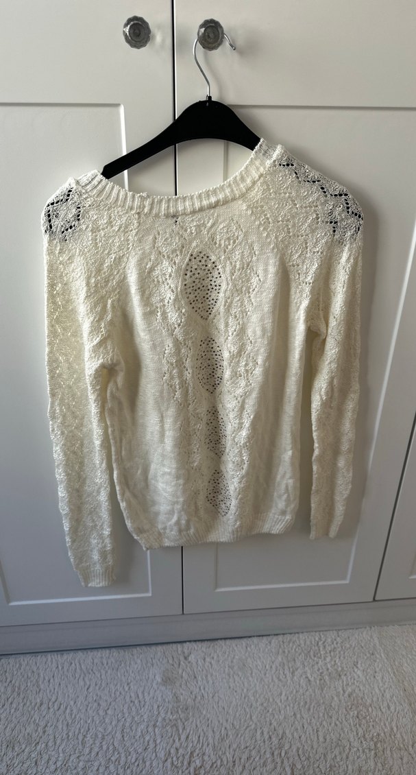 Beyaz, uzun kollu, yuvarlak yaka, bohem tarzda, gevşek kesim örgü kadın kazak. Günlük kullanıma uygun, sade ve rahat bir model.