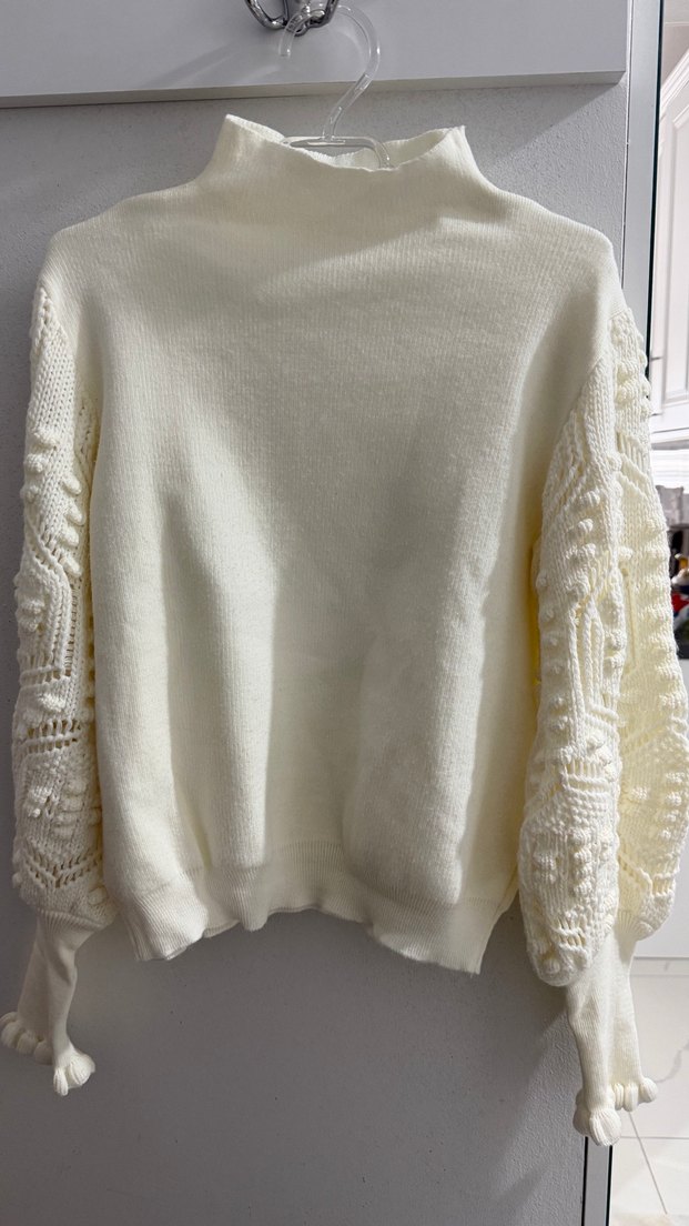 Beyaz renkli, uzun detaylı kollara ve yuvarlak yakaya sahip, bol kesim bohem tarzda örgü kadın kazak.