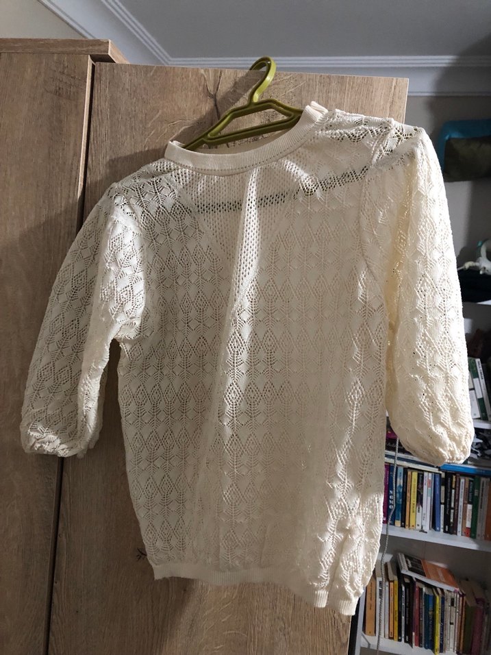 Beyaz renkli, gevşek kesim, yuvarlak yakalı ve uzun kollu örgü kadın kazak. Vintage bohem tarzıyla günlük kullanıma uygundur.