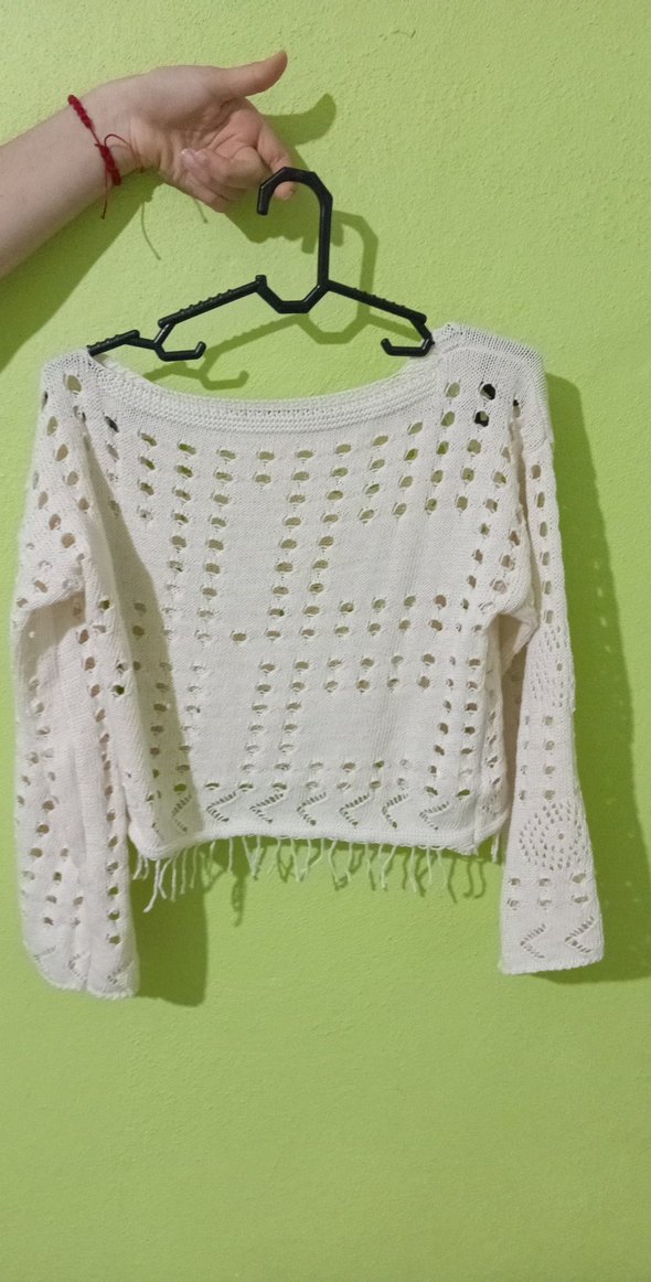 Beyaz renkli, uzun kollu, yuvarlak yaka, gevşek kesim bohem stil örgü kadın kazak. Kısa boy ve rahat, delikli örgü deseniyle dış mekan kullanıma uygun. Ayrıca ürün %100 pamuk içeriğiyle terletmez, doğal ve kaliteli bir yapıya sahiptir.