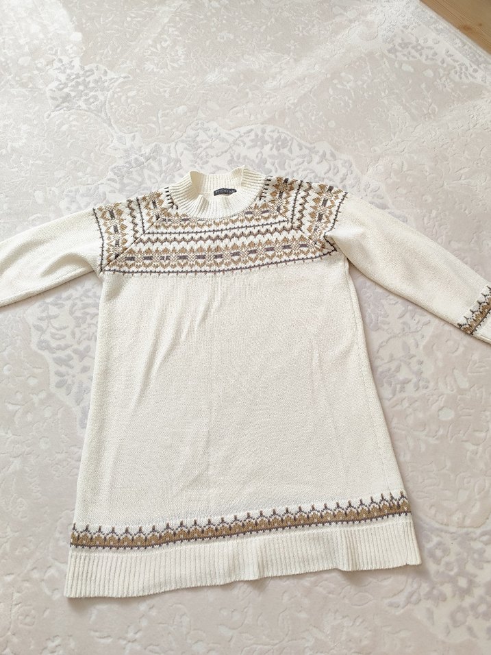 Beyaz renkli, örgü dokulu, bohem tarzda, yuvarlak yaka ve uzun kollu, bol kesim triko kazak. Yaka ve etek kısmında desen detayları bulunur, rahat ve gündelik kullanıma uygundur.
