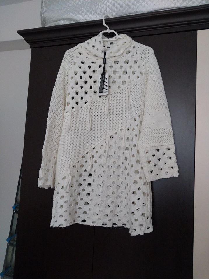 Beyaz renkli, yüksek yakalı ve uzun kollu örgü kazak. Bohem tarzı ve kısa boyu ile rahat ve özgün bir görünüm sunar.
