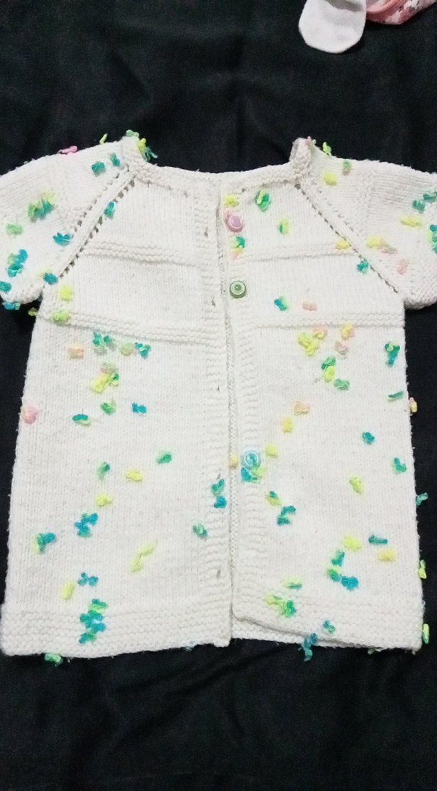 Uzun kollu, bol kesim beyaz örgü kız hırka, renkli pastel detaylarla bohem tarz sunar.