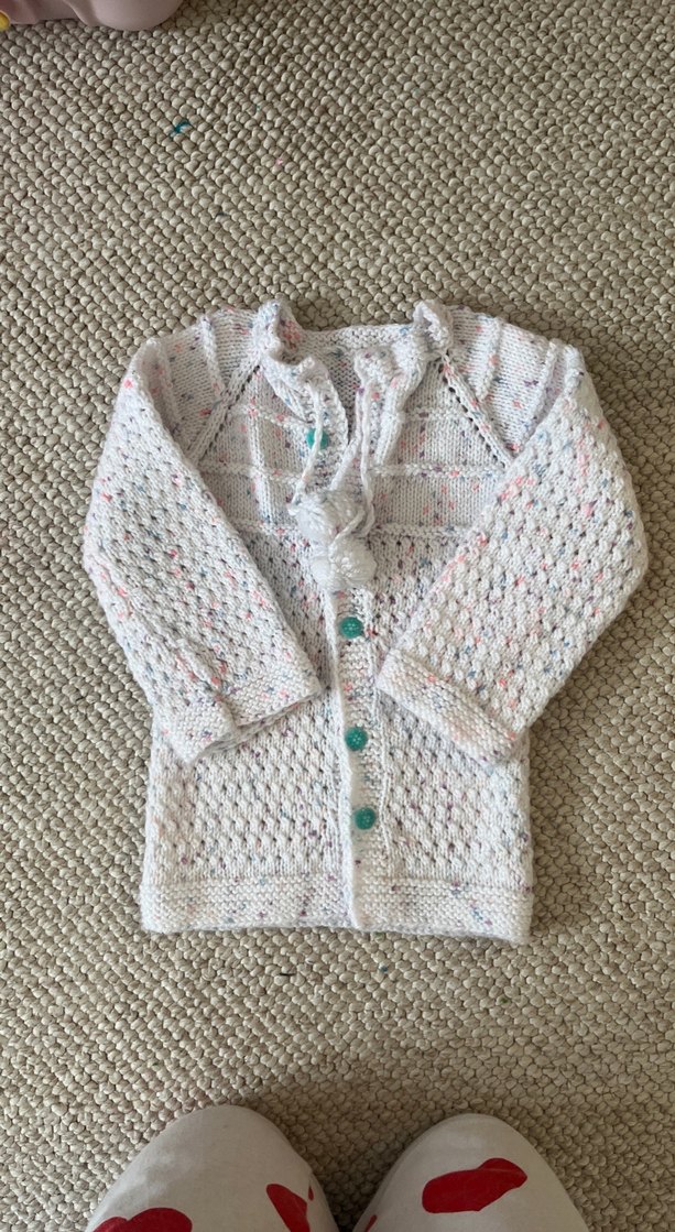 Beyaz renkli, bohem tarzda, uzun kollu ve bol kesim kız hırkası. Yumuşak dokulu örgü ve renkli düğmelerle detaylandırılmıştır.