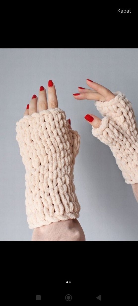 Yumuşak örme kumaştan yapılmış, beyaz renkli, bohem tarzda parmakları açık örgü eldivenler. Rahat ve retro görünüme uygundur.
