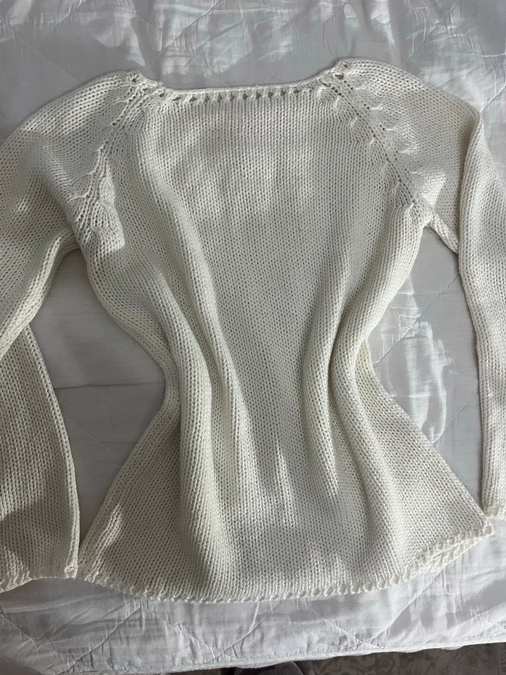 Beyaz renkli, uzun kollu, tek düğümlü örgü triko bluz. Salaş kesimi ve kayık yaka ile bohem tarzı sunar, günlük kullanıma uygundur. Hiç giyilmedi.