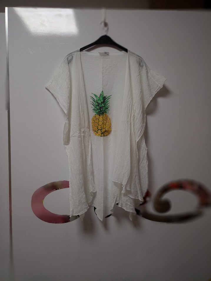 Kısa kollu, drapeli beyaz pamuklu tunik. Ananas baskılı, bohem tarzda, midi boyda ve rahat kesim.